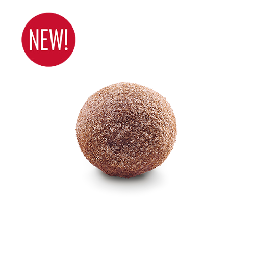 | A chocolate cake Timbit® coated in glaze, sprinkled with a gingerbread dusting. |