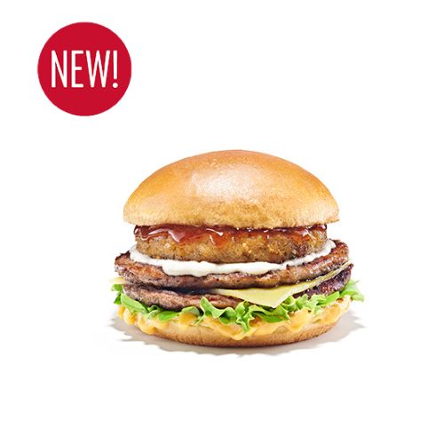 A double beef burger made using British & Irish Beef, sage & onion mayo, gravy, a stuffing slice, cheddar slice and lettuce in a toasted brioche bun.