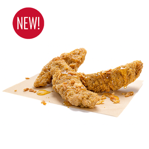 | 3 crispy, golden brown tenders drizzled with Roquito® Hot Honey and topped with crispy onions. |