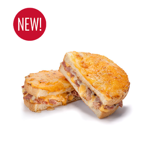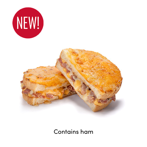 | A mix of three cheeses grated, a cheddar slice, cheese sauce and ham hock drizzled with Roquito® Hot Honey in a toasted sandwich. |